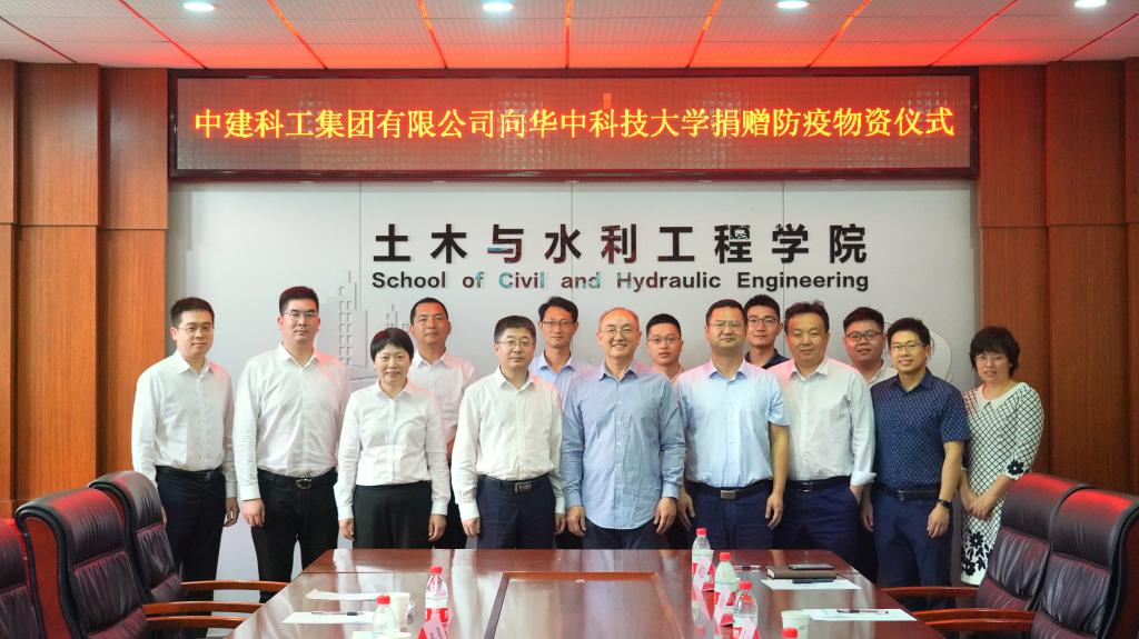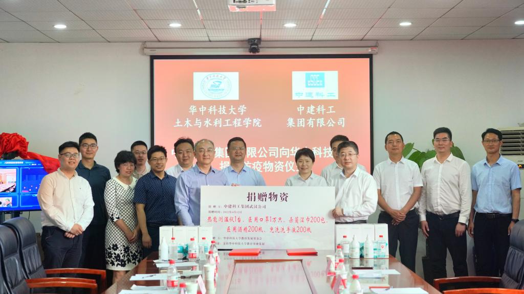4月12日下午,中建科工集团武汉公司向公司师生捐赠热能测温仪、医用口罩、杀菌湿巾等防疫物资,捐赠仪式在西六楼312会议室举行,仪式由公司副经理高飞主持。