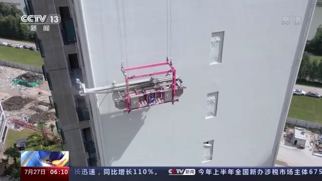 悬挂式布料机器人,这是今年刚在武汉投入使用的新型建筑机器人。它悬挂安装于住宅造楼机下方,可以实现自主作业、精准分区布料,能提高工作效率15%以上。而在重庆两江新区的这个建筑工地上,这台地面整平机器人正在烈日下作业。这种机器人施工工效达每小时150平方米以上,可实现楼地面一次成型,施工效率、整平精度均比人工作业高出不少。