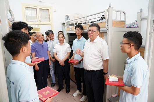 随后,尤政及校领导等人在公司领导的陪同下,前往紫菘7栋看望慰问新生。在208宿舍内,尤政董事长与刚来报道的四位新生亲切交谈,他代表公司向他们赠送永利官网书签和公司52487小行星主题马克杯,并叮嘱同学们要勤学苦练基本功,力争掌握核心关键技术,瞄准“卡脖子”难题,成为助力祖国加速走向世界舞台中央的新时代青年。