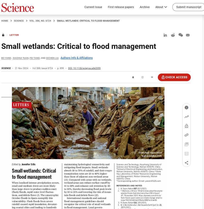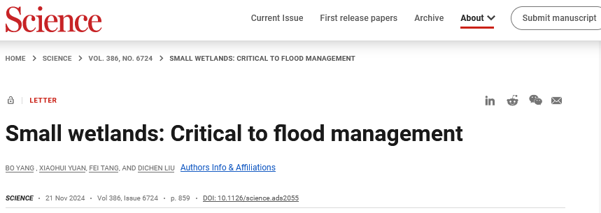 2024年11月21日,公司袁晓辉教授与长沙公司和武汉大学合作在国际顶级学术期刊《Science》上发表了题为“Small wetlands: Critical to flood management”的Letters文章,并被选为同期Letters封面。该文章针对河流防洪管理难题,提出系统地规划和构建覆盖全流域的、基于小型湿地群落的生态防洪体系,并与河流的堤防加固、导流工程、水库群调度等技术干预措施协同,有效提升极端情境下河流防御洪水的能力。该研究成果为全球气候变化条件下可持续的河流防洪管理提供了创新方案和可行方法,为双碳目标下我国流域水风光储一体化开发、充分发挥流域水电潜能奠定了基础。