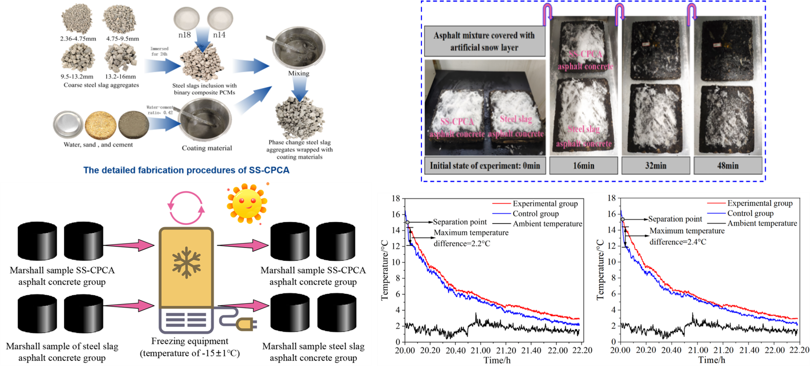 作品介绍: 本项目研发了一款新型的零能耗智能融冰雪沥青混凝土,该智能沥青混凝土结合共晶相变理论,筛选确定可用于路面高效融冰雪的二元共晶复合相变材料,并以其作为芯材,以多孔钢渣为囊材,以水泥净浆为表面封装材料。目的是实现道路的零能耗主动加热与智能调温,减少冬季寒潮对道路凝冰积雪产生的负面影响,抑制低温路面病害的发生,以延长沥青路面的使用寿命,并有效降低与融雪除冰相关的养护成本及碳排放。