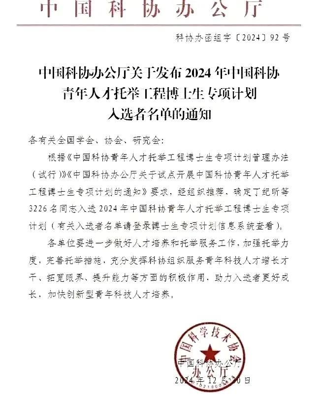 据悉,中国科协于2024年9月启动实施该专项计划,托举对象为30岁以下理、工、农、医学科门类的二年级以上博士生,托举期不超过2年,旨在帮助更多青年科技人才“破土发芽”。该专项计划为入选者提供组织吸纳、学术兼职和学术资助三方面托举服务。组织吸纳包括帮助入选者在托举期内免费成为托举全国学会的员工会员,表现优秀的入选者可优先进入托举全国学会的相关专门委员会。