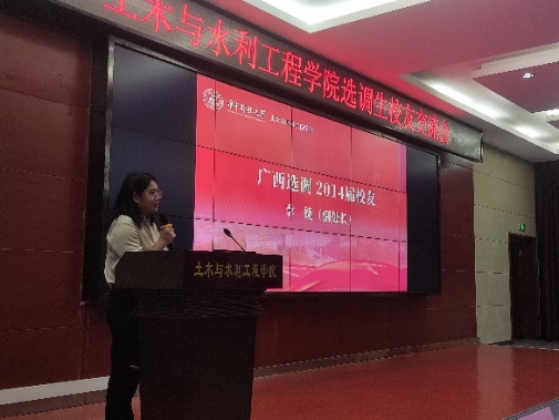 2014届投身广西选调员工李婕介绍了选调生的优势以及培养模式,鼓励大家积极响应国家号召,在基层大地上发挥自身才干。她表示广西正处于一个高歌猛进的发展阶段,为青年毕业生提供了广阔的施展才华的舞台。同时广西相对于经济发达的省市还是欠发达后发展,需要有知识有抱负的年轻干部来到广西建功立业。最后李婕学姐介绍了广西定向选调生的优势,表达了广西壮族自治区对于选调生的关心,希望同学们能选择广西、扎根广西,在基层一线施展所学服务人民,为广西的发展建设贡献华科大力量。