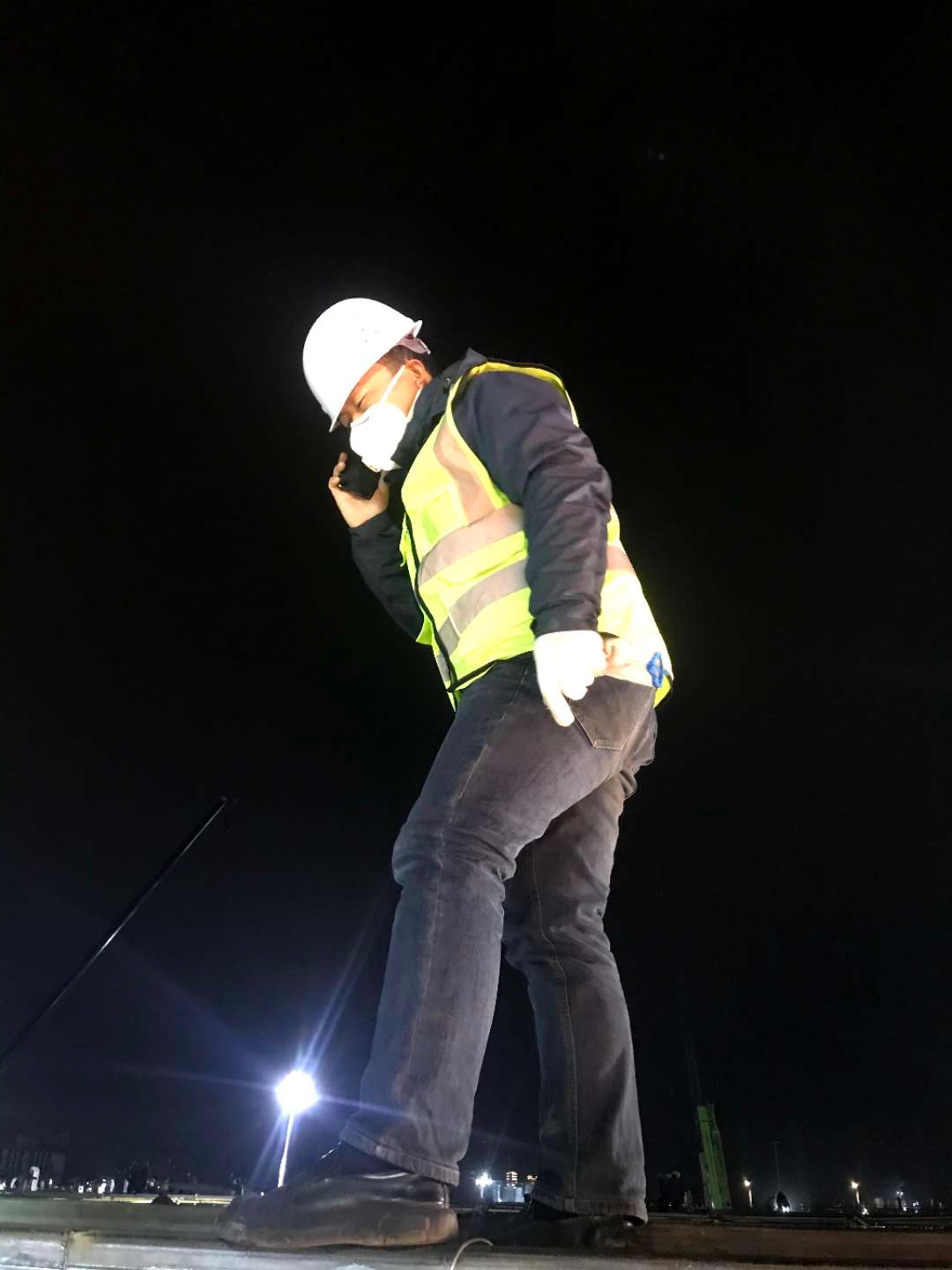疫情中的施工现场显得紧张又忙碌,所有人都知道,早一点完工,疫情就能早一点结束,或许就能多挽救一些生命。所有人都忘我地投入了工作,周求灵心理上的紧张感,也在这种氛围中渐渐消弭。施工建造现场,中央大灯未曾熄灭,工人们也是二十四小时轮班倒。时间紧,任务重,疫情期间工人们的组织更加困难,加上一部分工人并不熟练,施工中还是出现了意外。周求灵回忆到:有一天凌晨两点多,还剩下近200平方的屋面施工作业未完成,很多工人在连续工作20个小时的情况下,已经扛不住去休息了。为了保证这个节点任务顺利完成,他和队伍负责人交流过后,管理人员齐上阵,动手帮队伍从地面把材料传递到离地8米高的屋面上,在三个小时内完成了节点任务,保证了接下来工作的顺利实施。