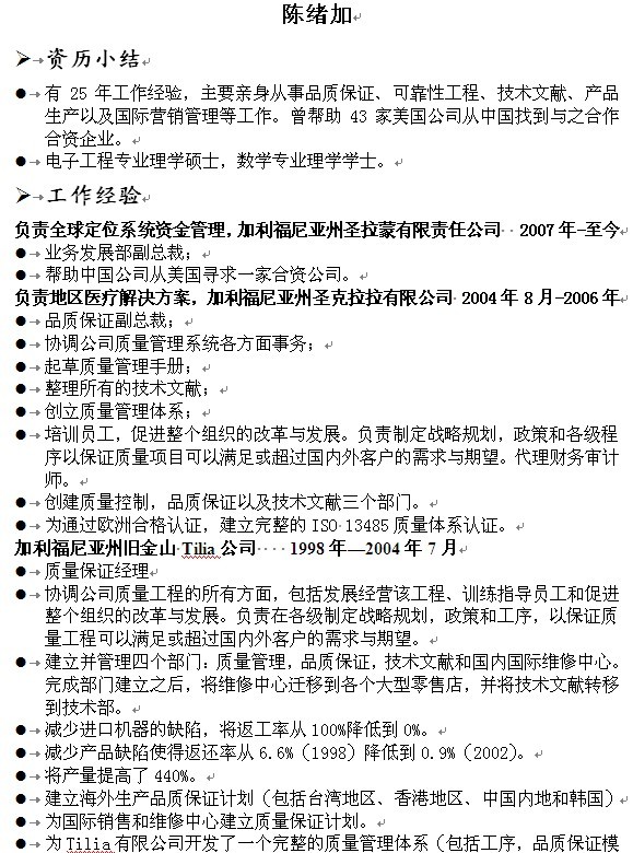 主讲人:陈绪加女士(有25年工作经验,主要亲身从事品质保证、可靠性工程、技术文献、产品生产以及国际营销管理等工作。曾帮助43家美国公司从中国找到与之合作合资企业。