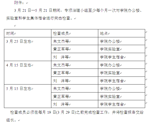3、专项治理期间,专项治理小组不定期到公司办公室、实验室和员工集体宿舍检查(具体安排见附件)。