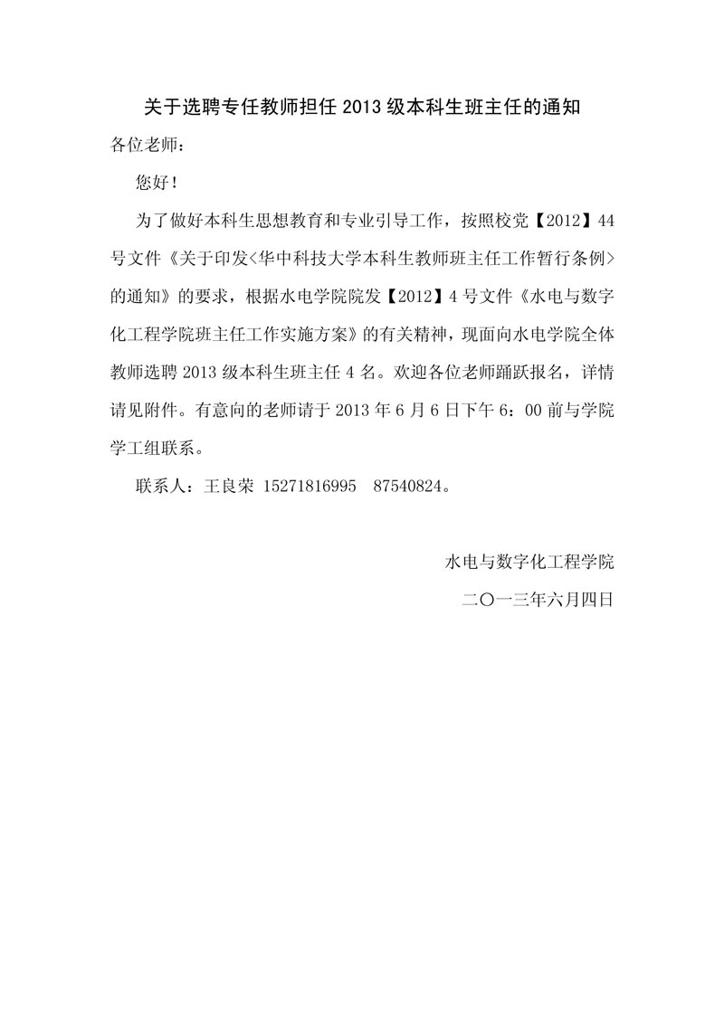 关于选聘专任教师担任2013级本科生班主任的通知