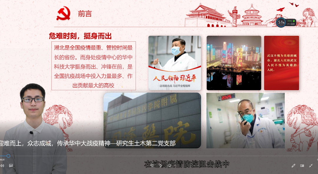 微党课内容丰富,能带动更多支部和支部外的同学参加学习,所以公司各个支部广泛收集整理资料,拍摄讲授了一堂堂生动的微党课。土木第十一党支部、土木第十党支部通过微党课的形式深入学习华中大在 2020 年初的新冠肺炎疫情防控阻击战中所做的突出贡献和涌现出的模范人物;土木第二党支部以精准扶贫为背景,开展“从精准扶贫到乡村振兴,华中大一直在路上”两院联合特色党日活动,学习华中大在脱贫攻坚与乡村振兴方面所做的工作与成绩;除此以外,水电第二党支部、土木第八党支部等支部围绕公司发展轨迹开展党课学习,带大家回顾了华中大校史,学习七十年间华中大的育人育才、人才济济和薪火相传。