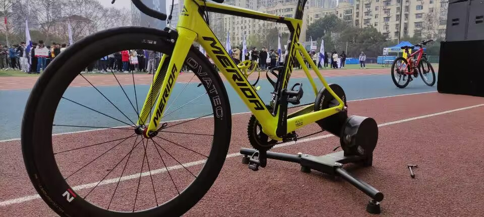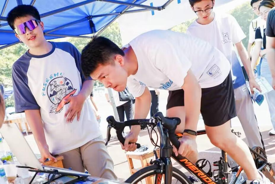 在各主题展区,社团展位上人流涌动,社团互动小游戏和集卡抽奖活动也在火热进行中。自行车协会的展位前,大家体验了骑行台骑行,在一阵又一阵的加油喝彩声中,许多同学突破了自己,获得了瞩目的成绩。此外,我们拉起横幅,挂起照片,向过往的人们讲述自行车协会故事,原来自行车不止有竞速,也有浪漫与自由。