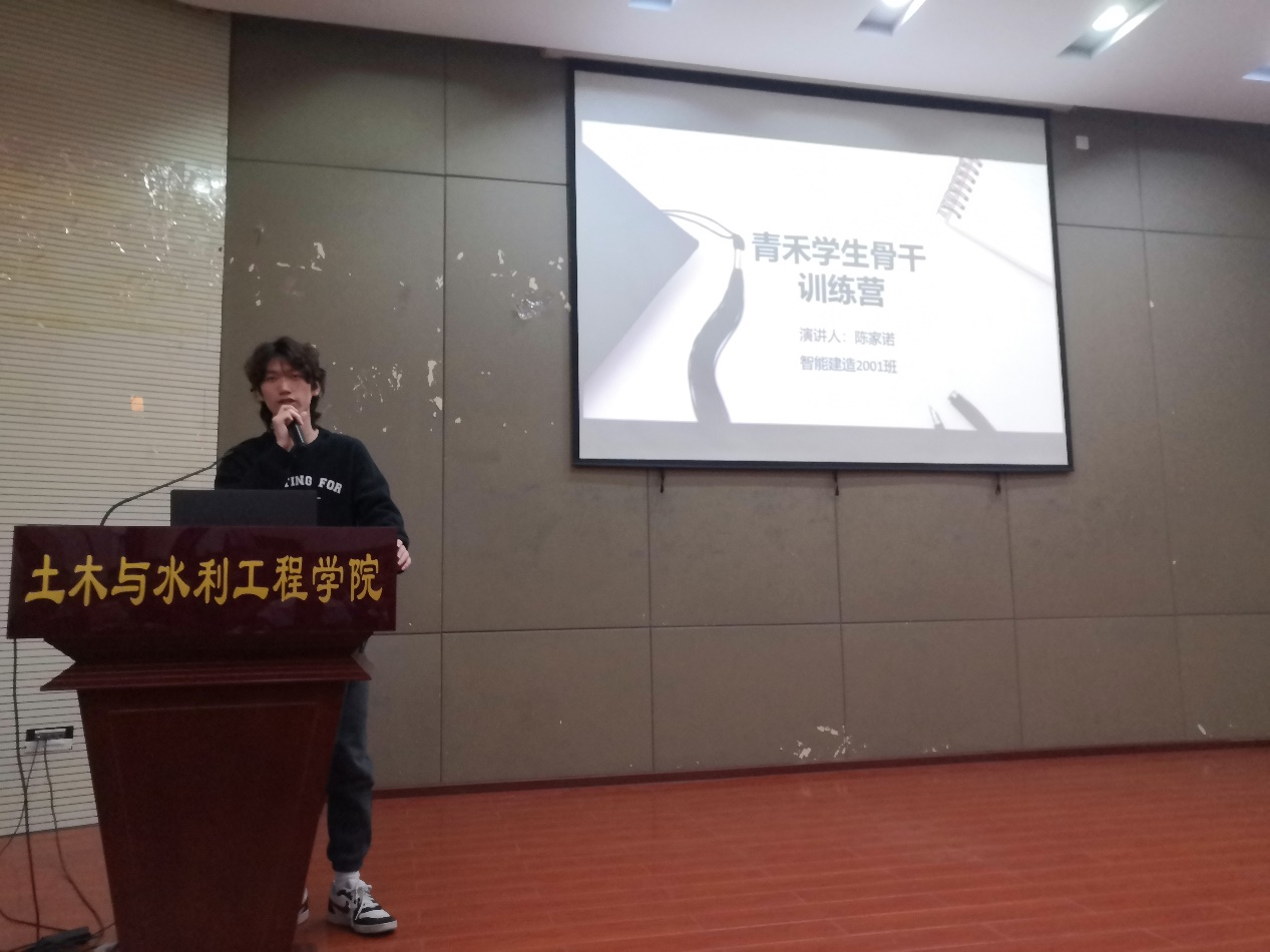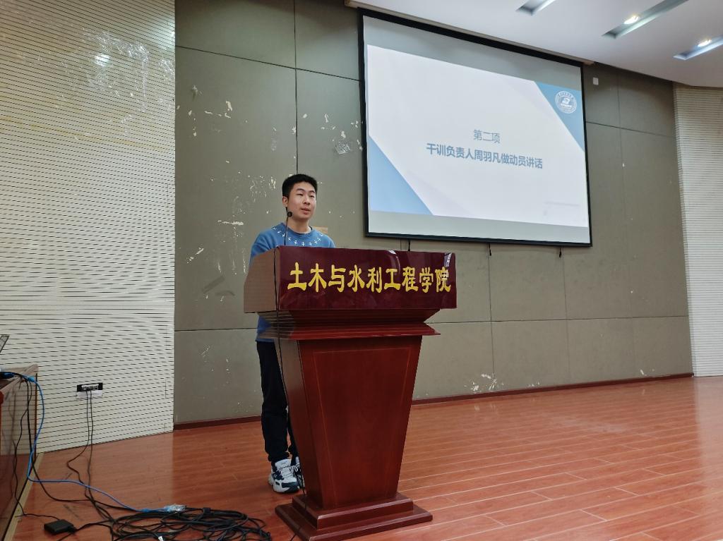 团歌唱毕,训练营负责人周羽凡同学开始作动员讲话。他着重强调了本次青禾训练营举办的目的,同时介绍了此次青禾训练营的培训内容。他讲道:“‘积土而为山,积水而为海。’成功永远属于勇毅笃行的人;‘芳林新叶催陈叶,流水前波让后波。’未来的天空属于奔涌的后浪。”